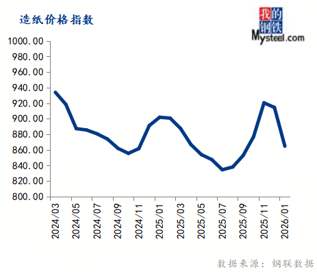 1月份造纸价格指数为864.82,环比下跌5.44%,同比下跌4.12%。
