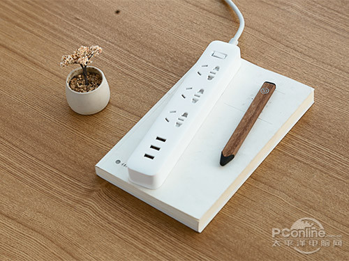 小米插线板采用一体成型设计,不可拆卸,手感很牢固,AC插脚三个铜片出厂的时候均使用透明塑料套进行保护。小米插线板仅铅笔盒大小,其提供3组国标插孔,3个USB充电口(总电流3.1A,单口支持2A快充),提供110V-240V全电压。