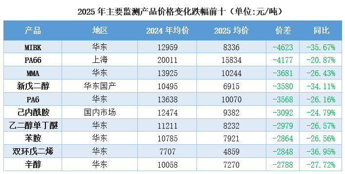 丙烯酸行业占了1个名额(MMA)。2025年国内甲基丙烯酸甲酯(MMA)下跌的主因集在于供需压力以及新装置集中投产等问题上。具体来看,2025年MMA市场创五年价格新低。全球市场共振下行,加之基本面疲软导致上下游普遍看空后市。本年度下游以及终端客户多维持谨慎采购心态,同时外需减弱内需增长不足等因素进一步加剧了价格下行的压力。