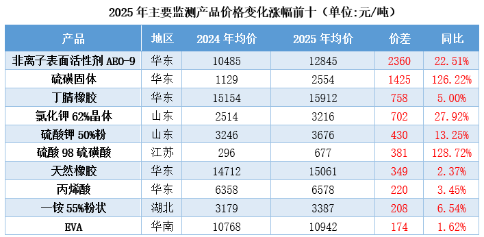 环氧乙烷行业占了1个名额(非离子表面活性剂AEO-9)。2025年非离子表面活性剂AEO-9均价大幅上涨,涨幅达22.51%。以AEO-9为例,2025年均价较2024年均价上涨达2360元/吨。虽然年内环氧乙烷价格运行区间低于往年,但棕榈仁油价格大幅上行,带动表活另一主要原料脂肪醇价格持续走高,给表面活性剂市场带来有力提振,年内国内非离子表面活性剂价格明显高于往年。